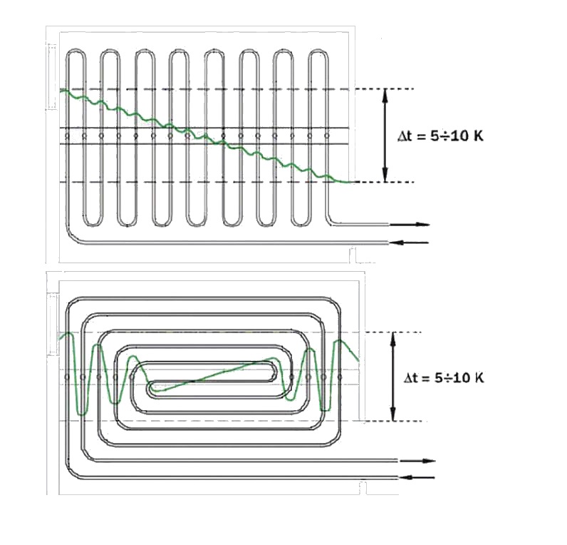 Dans les grandes pièces, il est recommandé d'utiliser des schémas combinés pour obtenir un transfert de chaleur maximal. Par exemple, je mets un «escargot» au centre et des «serpents» sur les bords, de sorte qu'un chauffage plus élevé se produit le long des murs avec des fenêtres.
