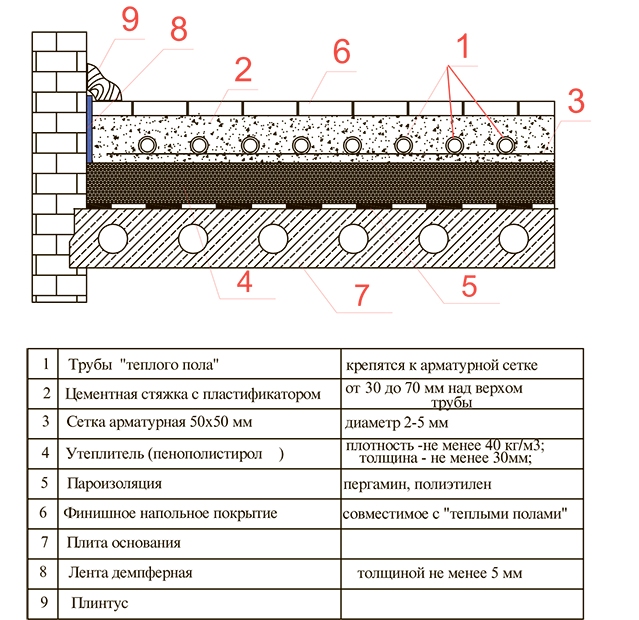 Après avoir décidé du schéma, vous pouvez commencer à acheter les matériaux nécessaires: tuyaux et pièces pour le montage des circuits, imperméabilisation, isolation, treillis d'armature, mélange sec pour la préparation de la solution, ruban amortisseur.