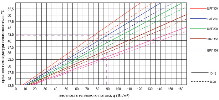 - Le débit des tuyaux est calculé comme suit: avec un pas de 100 mm - 10 m / m², avec un pas de 150 mm - 6,7 m / m².