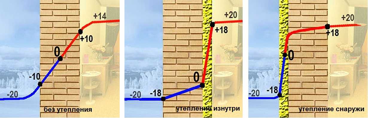 Si la couche d'isolation est montée à l'intérieur, le mur gèle sur toute l'épaisseur, etpoint de rosée se rapproche du salon.