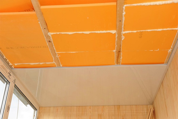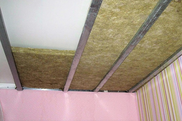 Contrairement au sol, le plafond ne nécessite pas la création de tartes multicouches. Habituellement, un matériau léger à faible conductivité thermique est choisi pour l'installation, qui peut être installé à la fois sur la caisse et sur de la colle ou des chevilles spéciales