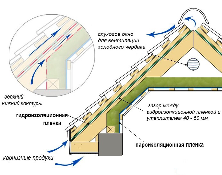 Si le grenier n'est pas résidentiel, alors en raison de la ventilation naturelle à travers les évents, les projecteurs et les lucarnes, la vapeur s'en érode rapidement dans la rue. En conséquence, la condensation ne se forme pas à l'intérieur et le système de chevrons n'est pas exposé aux effets négatifs de l'excès d'humidité.
