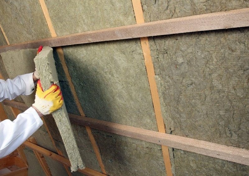La pose de l'isolant s'effectue de l'intérieur du grenier sur la membrane perméable à la vapeur installée. Si la laine minérale est sélectionnée, elle doit être coupée en morceaux de 2 à 3 cm de plus que les espaces entre les chevrons ou les barres de la caisse. Les minvata doivent entrer entre eux avec une légère pression et y rester à cause de la pression.