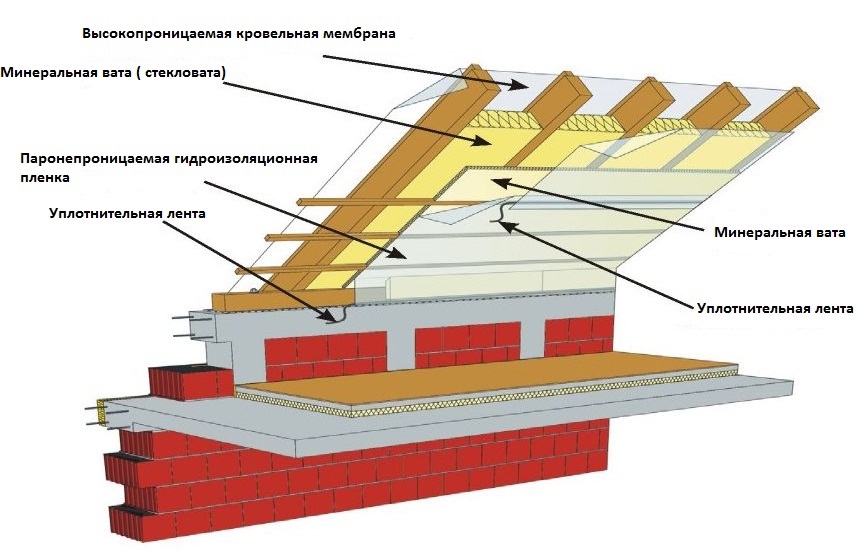 Pour chauffer correctement le grenier de l'intérieur, vous devez créer une tarte de cinq couches, en commençant par le toit à l'intérieur: