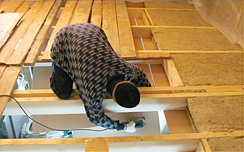 Lors de la pose à sec, le matériau s'effrite simplement entre les poutres du sol et est doucement éperonné. Le revêtement de sol préliminaire du film n'est pas nécessaire, car la laine écologique est un absorbant naturel.