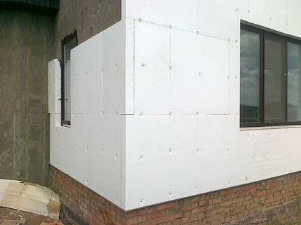 L'isolation est fixée au mur avec de la colle et des chevilles. À l'extérieur, il est protégé par un mince profilé métallique en aluminium. Seule une fine couche décorative de plâtre y est appliquée, pour niveler la surface du mur et lui donner une apparence visuelle complète.