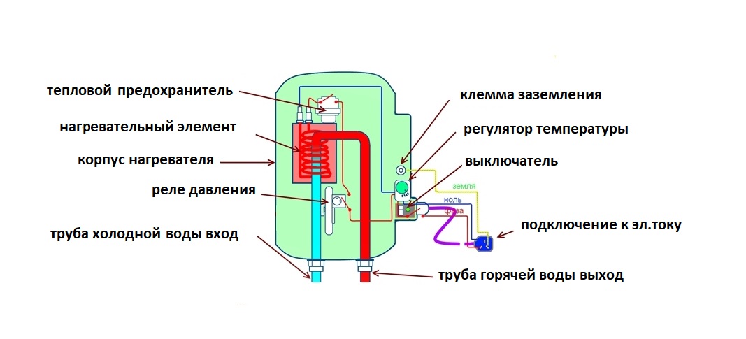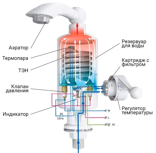Le réservoir de chauffage a une petite taille, à l'intérieur de laquelle un élément chauffant ou une spirale non isolée est installé pour chauffer l'eau froide. Dans un système fermé, les éléments chauffants n'entrent pas directement en contact avec l'eau, le flux passe à travers un tuyau en cuivre ou en laiton, donc un tel appareil de chauffage n'a aucun problème de tartre et la nécessité d'un nettoyage régulier.