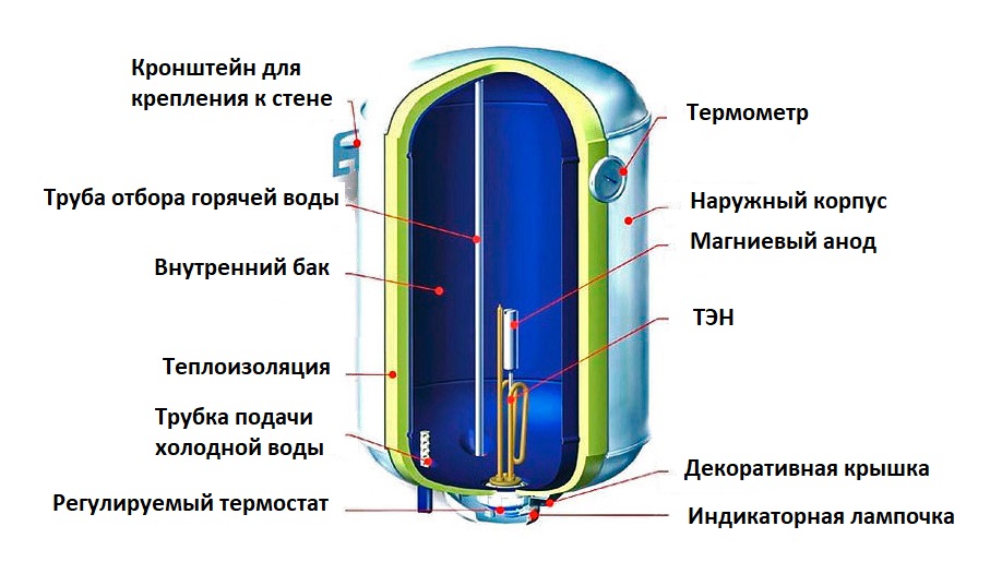 L'appareil lui-même est un grand réservoir calorifugé avec des tuyaux pour fournir de l'eau froide et chaude. Un chauffage de 1 à 2 kW, un capteur de température et une anode en magnésium protégeant l'appareil contre le tartre sont placés à l'intérieur du réservoir.