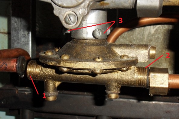 - Démontez le bloc de gaz en le déconnectant du tuyau de gaz et en desserrant les trois vis qui le relient au bloc d'eau. En dévissant l'écrou-raccord, le bloc de gaz est tenu à la main.