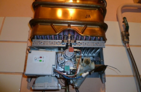 Si les ouvertures du brûleur principal se bouchent, en plus du claquement qui se produira pendant le fonctionnement, un bruit important sera entendu pendant le fonctionnement. Afin d'éliminer ce problème, vous devez démonter une partie de la colonne. Le brûleur est nettoyé avec une brosse douce (le colmatage sera visible). Il n'est pas nécessaire de dévisser les buses du cadre, mais il est également recommandé de nettoyer leurs trous.