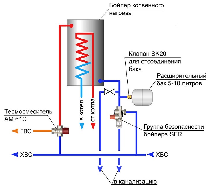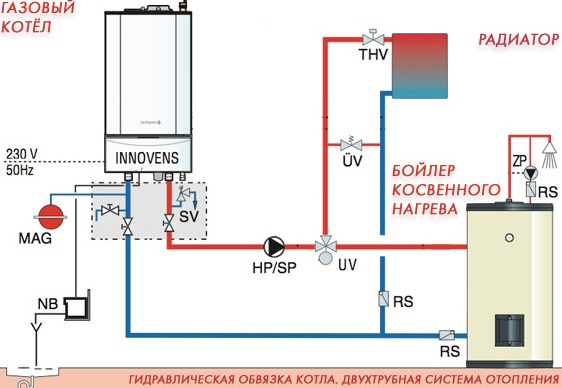 Comment connecter la chaudière indirecte pour l'eau chaude à une chaudière à gaz, lisez un article séparé sur notre site Web.