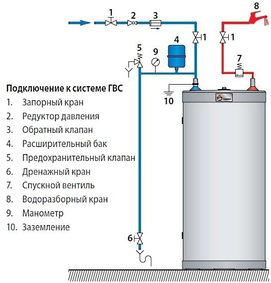 La ligne de sortie de liquide chauffé est également équipée d'une vanne d'arrêt par défaut. Cependant, cette exigence n'est pas obligatoire, et si le robinet n'est pas fourni à la sortie de l'alimentation en eau chaude, il n'y a pas d'erreur grave à ce sujet.