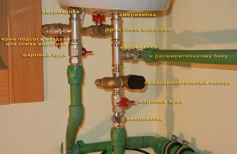Le trou de vidange de ce type de chauffage, quel que soit le modèle, est généralement situé en dessous. Vous devez d'abord assembler et installer le soi-disant groupe de sécurité. Il s'agit d'un ensemble de vannes et de raccords conçus pour éviter diverses situations d'urgence pouvant survenir pendant le fonctionnement de l'appareil.