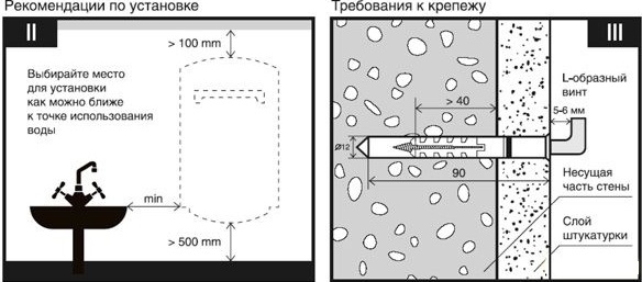 En fait, il n'y a rien de compliqué à installer soi-même le réservoir de stockage de la chaudière. J'ai traité cela un peu plus d'une heure. Nous avons choisi un modèle mural pour 30 litres. Comme il s'est avéré plus tard, pas assez pour une famille de trois personnes, vous avez besoin d'au moins 50 litres. Bien sûr, il vaut mieux s'accrocher au mur, qui est plus solide et prendre de bonnes ancres. Le raccordement à l'alimentation en eau n'a pas non plus posé de problèmes.