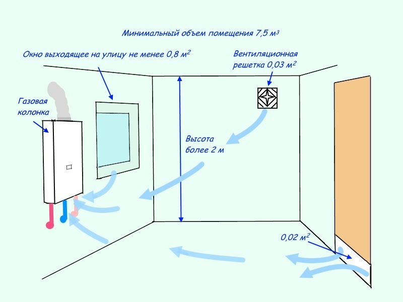 Un appareil de chauffage au gaz est installé dans la cuisine ou dans un autre bâtiment non résidentiel d'un volume d'au moins 7,5 mètres cubes. m, en présence de flux d'air à travers la grille de ventilation d'une superficie de 0,03 m2.