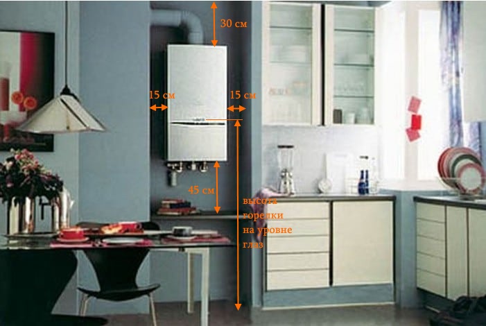 Dans le passeport pour la colonne de gaz ou les instructions d'installation, le fabricant indique généralement les distances requises entre l'appareil et les structures du bâtiment de la pièce. S'il n'y a pas de telles instructions, le réchauffeur de gaz est installé en fonction de la facilité d'utilisation, de l'installation, de service et réparation.