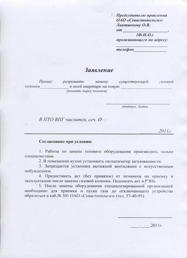 Un exemple du formulaire de demande fourni au service de gaz pour remplacer la colonne. Dans certaines régions, des exigences supplémentaires peuvent être avancées pour l'installation d'un détecteur de gaz, interdisant les systèmes de ventilation turbocompressés et autres.
