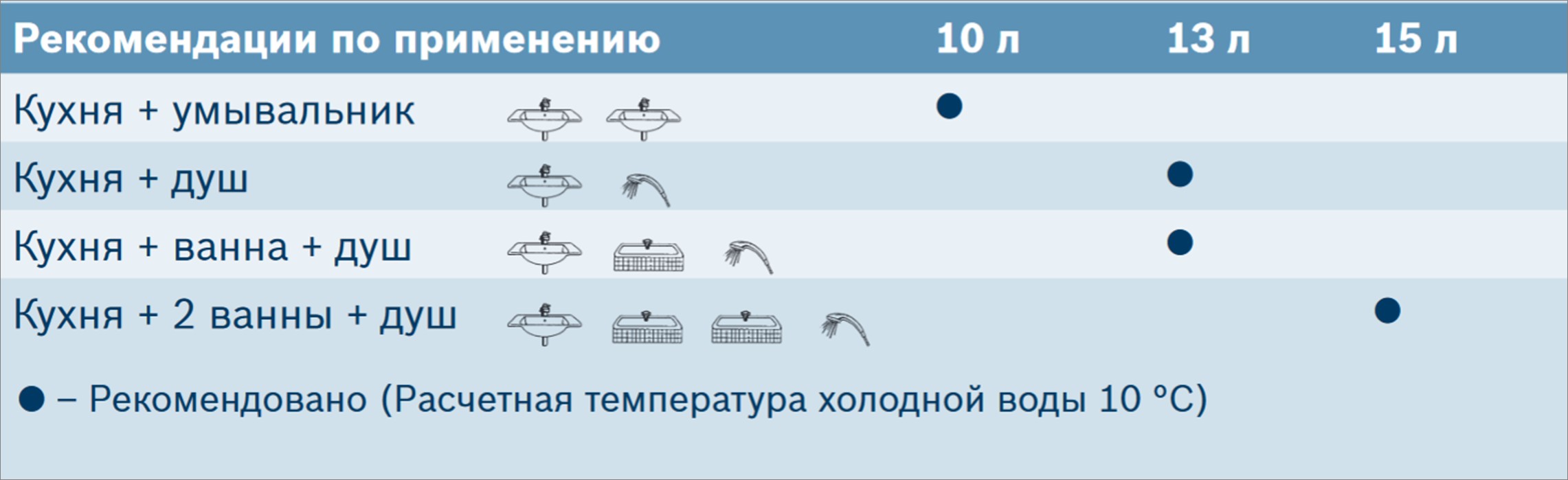 Pour une famille de 1 à 2 personnes, une capacité de colonne de 10 litres par minute suffit généralement, ce qui correspond à une puissance de 17 à 18 kW. Si le remplacement de l'appareil est lié à la volonté d'utiliser deux points de consommation d'eau en même temps, par exemple un évier et une douche, le chauffe-eau doit avoir une capacité d'au moins 13 l / min.