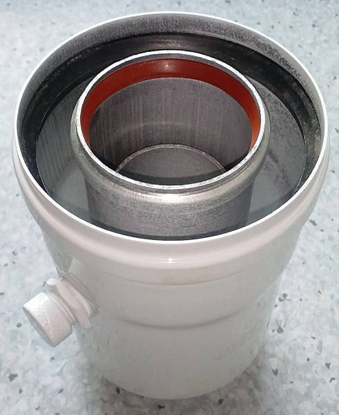 Pour la colonne et la chaudière, des tuyaux coaxiaux sont installés avec une inclinaison vers la rue. Cela est nécessaire pour que le condensat formé dans le canal d'air s'écoule.
