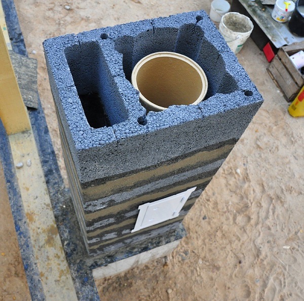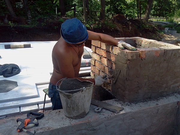 Avant de commencer les travaux, la fondation est protégée de l'eau par une couchebicrosta ou matériau de toiture. La maçonnerie est réalisée dans un cercle avec une reliure. Tous les 3 à 5 rangs présentent un treillis métallique. L'avion est constamment surveillé par niveau. Lorsque le tubage est disposé, le vide entre le tuyau et la maçonnerie est rempli d'isolant.