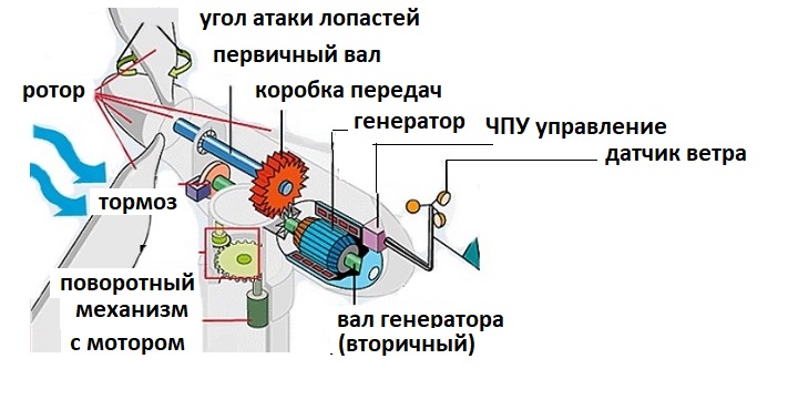 O gerador eólico funciona devido à rotação das pás presas ao rotor. O próprio rotor é fixado no eixo do gerador, que gera uma corrente elétrica. A energia é transferida para as baterias. Aqui acumula e alimenta eletrodomésticos.