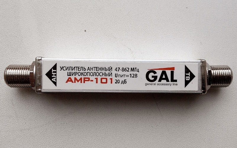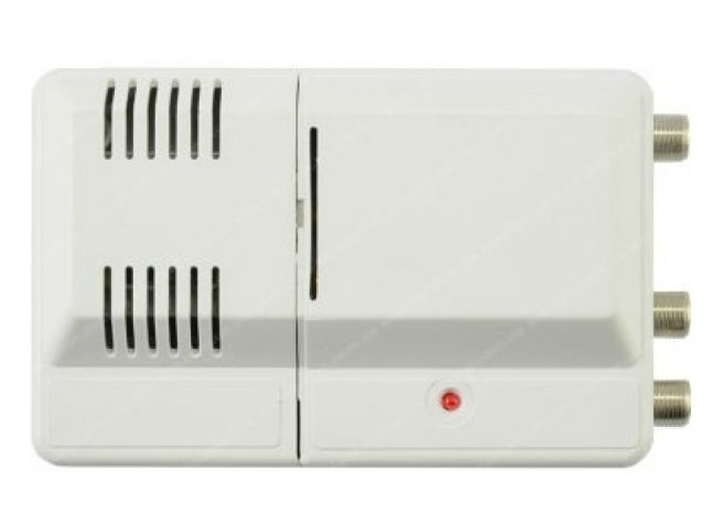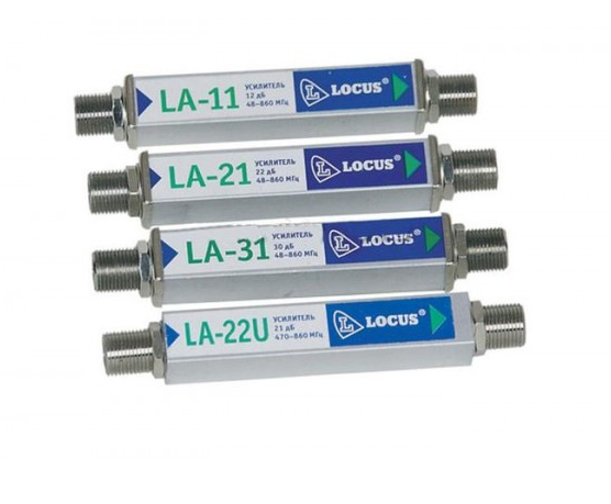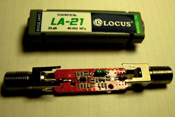 A segunda opção é um amplificador de antena Locus LA-21, que custa cerca de US $ 4.A caixa do amplificador é projetada de forma que os conectores do tipo F facilitam a instalação em uma quebra de cabo, a energia é fornecida através de uma fonte estabilizada através de um cabo coaxial.