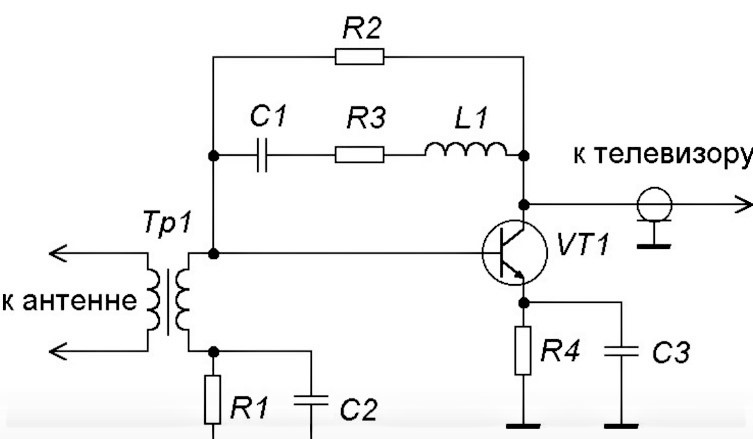 O sinal da antena entra no transformador correspondente e é transmitido através do transistor, amplificado e estabilizado no emissor. Depois, há uma correção de frequência no segundo estágio dos transistores em cascata, após o qual o sinal entra na TV.