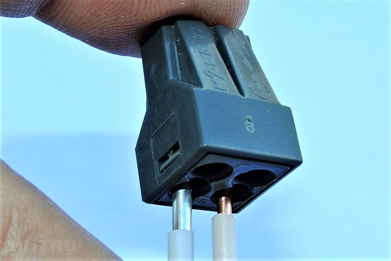 - Nós inserimos o condutor no soquete, movemos todo o caminho. Idealmente, a extremidade do núcleo sem isolamento deve caber inteiramente no alojamento.