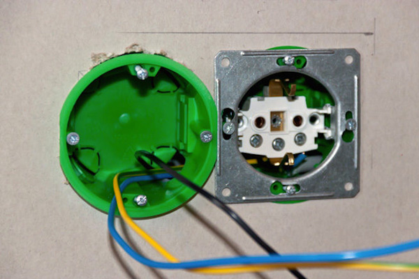 É feito um orifício na parede para instalar a caixa de soquete - você terá que perfurar a parede. Em seguida, o fio de alimentação é rosqueado para dentro e o vidro é fixado com uma mistura de alabastro. Resta conectar o mecanismo de trabalho da tomada - as etapas são as mesmas da saída dupla.