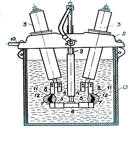 Isso causa, em cada polo do disjuntor em dois pontos, o aparecimento de um arco e a decomposição do óleo. Dentro das conchas 12, a pressão atinge de 0,5 a 1 MPa, ativando assim o processo de desionização. Dentro de um máximo de 0,1 s, os arcos são extintos e as conchas, subindo, aparecem sob a cobertura e aumentam o volume da almofada de ar.