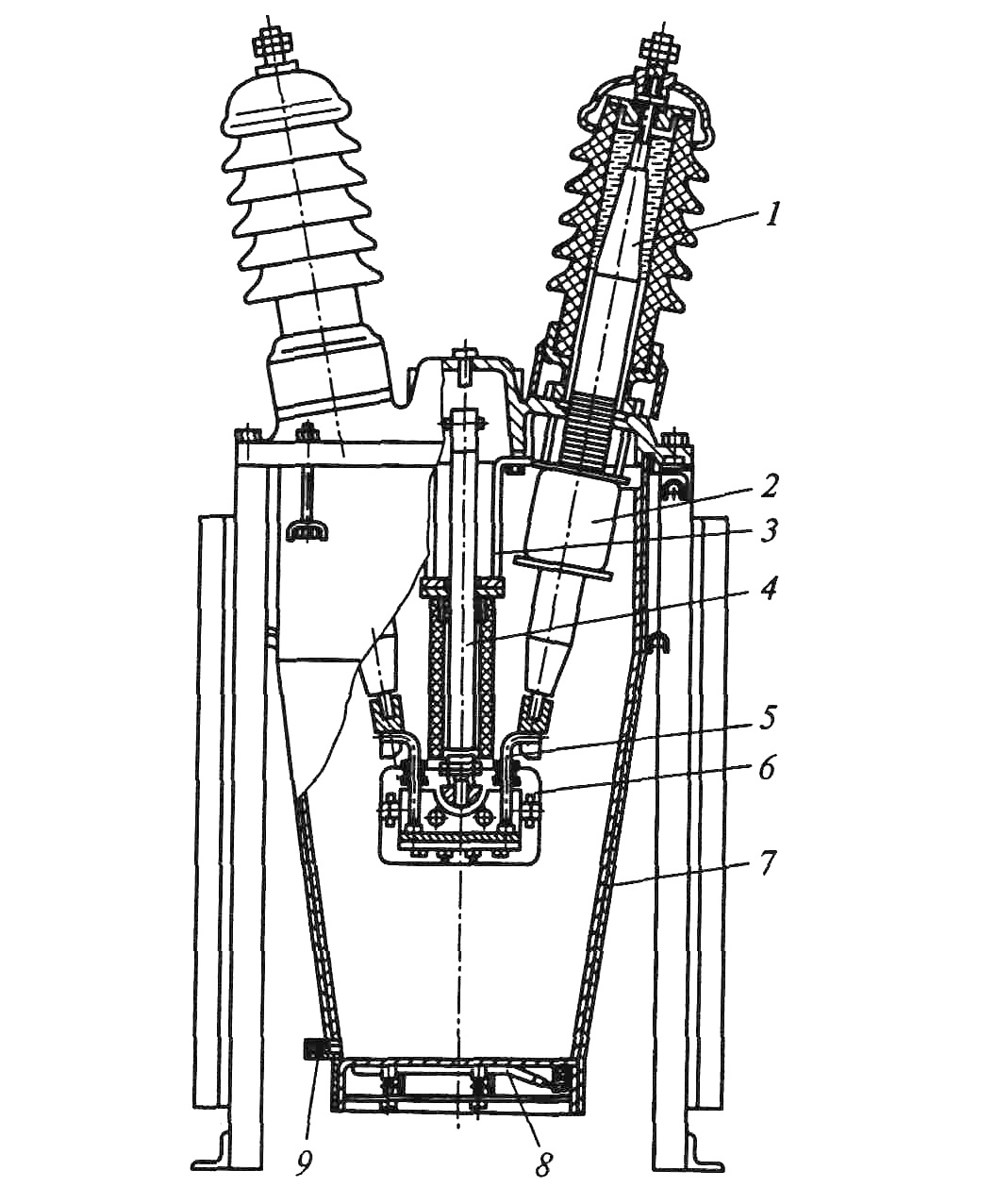 O design do poste é idêntico para toda a série de comutadores. Nos tanques de MV para classificações atuais de 630 a 1600 A, existem 5,5 kg de óleo, acima de 1600 e até 3150 A inclusive - 8 kg.