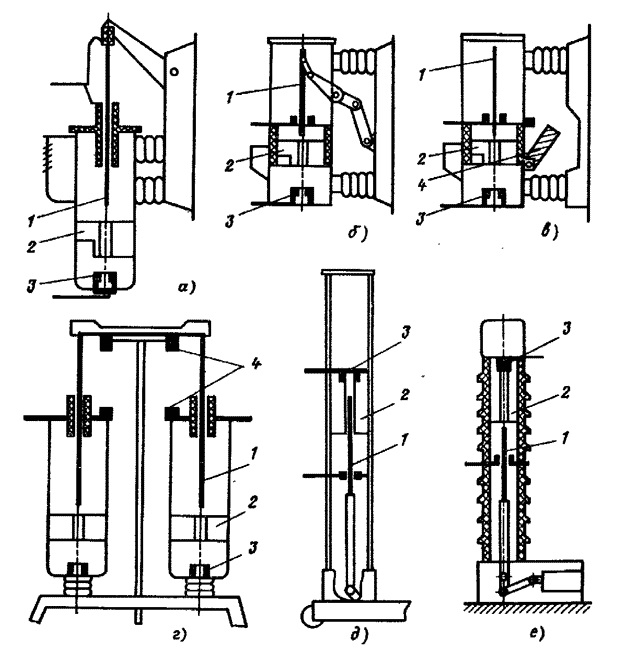 Os acionamentos dos tanques e dos disjuntores com baixo teor de óleo podem ser manuais, montados automaticamente na bobina de comutação do solenóide ou montados por mola. No segundo caso, é usada a propriedade magnética do solenóide, que permite apertar o núcleo de metal conectado por meio de um sistema especial ao eixo MV.