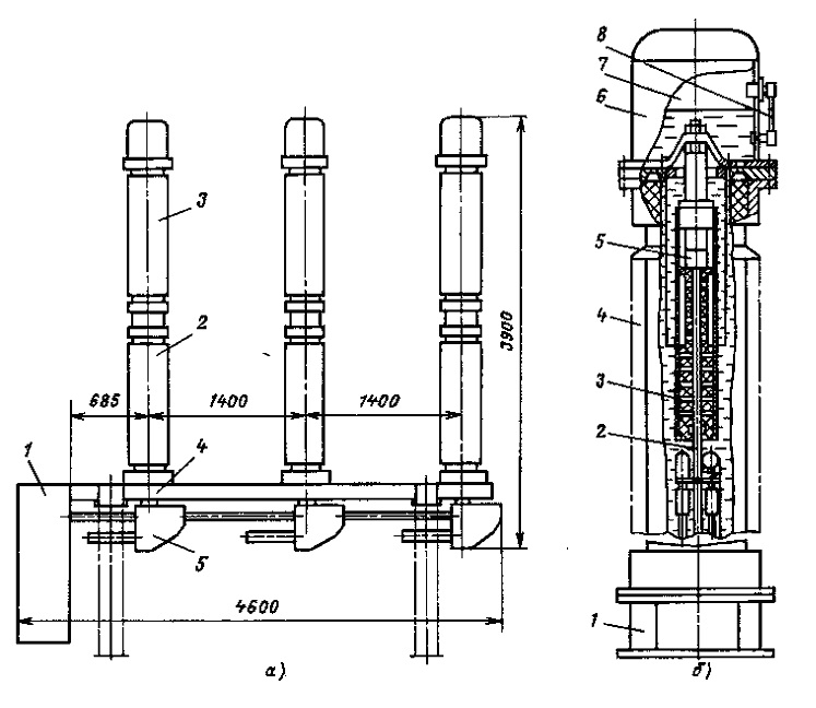 O módulo é mostrado no lado direito da foto, onde: 1 é o coletor, 2 é o contato móvel conectado ao coletor através de coletores. A câmara do interruptor é indicada pelo número 3, o contato fixo é 5. Todos os itens acima são colocados em um isolador oco (4) de porcelana. No interior, há óleo de transformador e, no topo, uma tampa (6).
