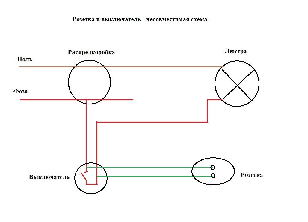 Pode ser visto no diagrama que, quando o interruptor está aberto, o zero chega à saída pelo lustre - ele pode fornecer tensão, por exemplo, a um ferro. Quando o interruptor é fechado, apenas a fase entra na tomada - ligar o ferro é inútil, mas o lustre está ligado.