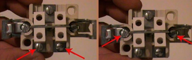 Normalmente, a entrada de fase está localizada na parte superior e duas saídas na parte inferior. No projeto de tais dispositivos, há uma placa à qual os contatos de saída móveis estão conectados, seu objetivo é óbvio. Para fixar os contatos em um dispositivo assim, é necessário desaparafusar o parafuso da braçadeira, inserir a borda descascada do fio no orifício e depois aparafusar os prendedores.