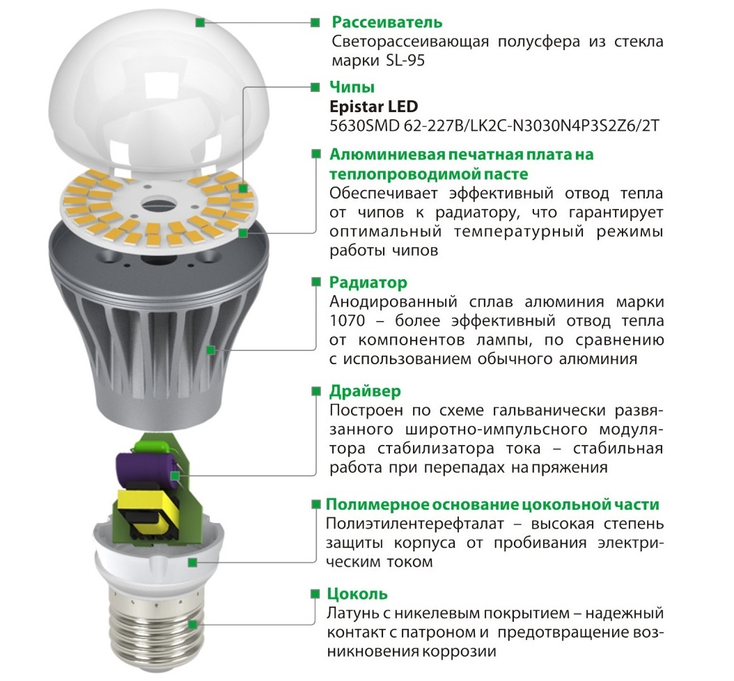Dependendo da potência, tamanho e finalidade da lâmpada de diodo, o dispositivo pode ter de uma a várias dezenas de peças.