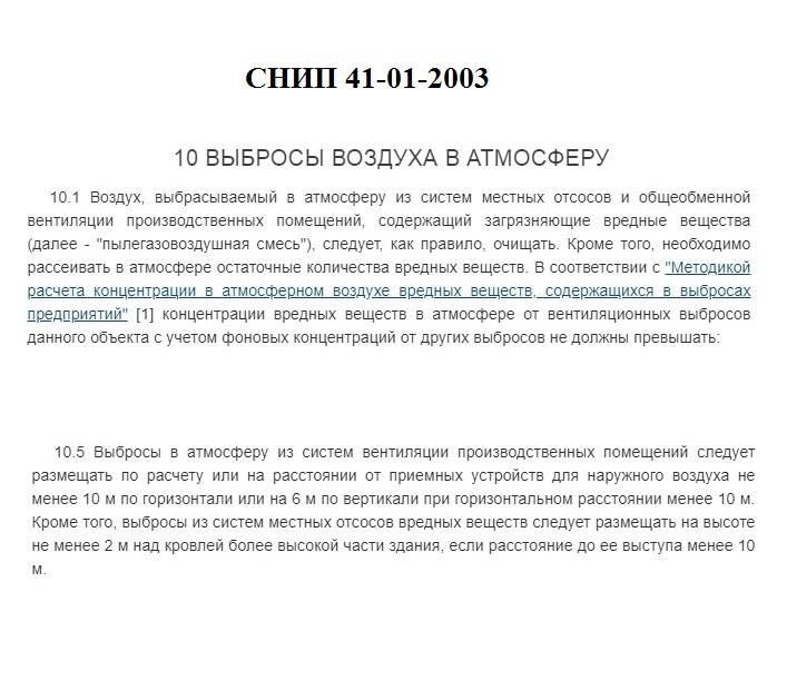 Boa tarde, Veronica. Eu aconselho você a elaborar o “SNIP 41-01-2003”, especialmente a seção 10, referente às emissões de substâncias contaminadas. Não vou reescrever os pontos - anexei uma captura de tela. Além das dimensões, que regulam a localização do tubo em relação aos elementos do edifício, há um ponto 10.1 interessante que requer limpeza preliminar das emissões. Você não precisa de limpeza, mas existem dispositivos de limpeza que removem o problema de um tubo de alta ventilação.