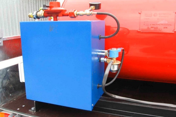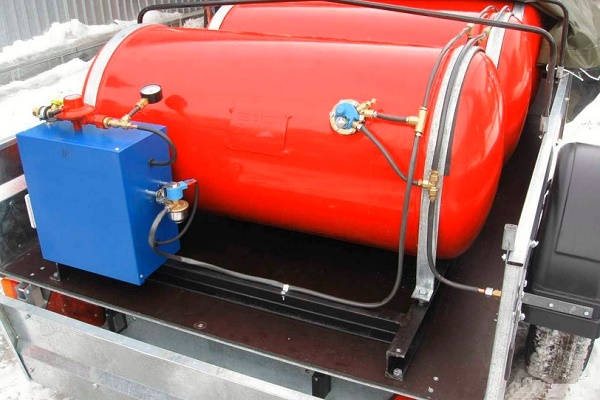 De fato, este é o mesmo cilindro de gás, apenas de maior volume e com sistema de aquecimento a gás. Essa quantidade de combustível liquefeito pode aquecer uma pequena cabana durante o inverno.