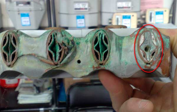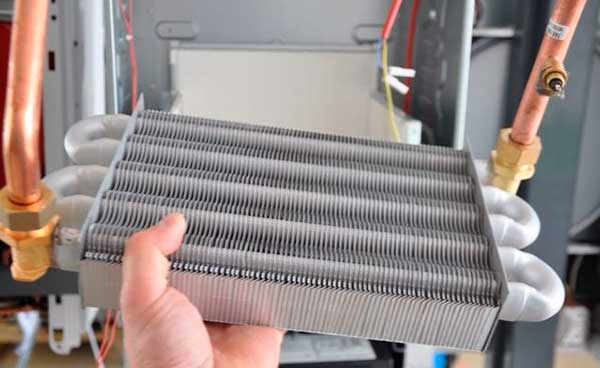 Os canais dos tubos do trocador de calor ficam entupidos com sais devido à água dura, o que interrompe a circulação do líquido. Para restaurar a caldeira a gás, é necessário limpar o trocador de calor.