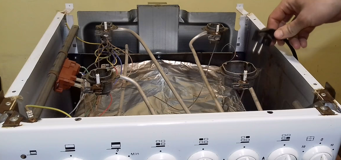 - Desligue o fogão da tomada, levante a mesa e encontre a unidade para a qual a fiação das velas e o botão de auto-ignição vão.