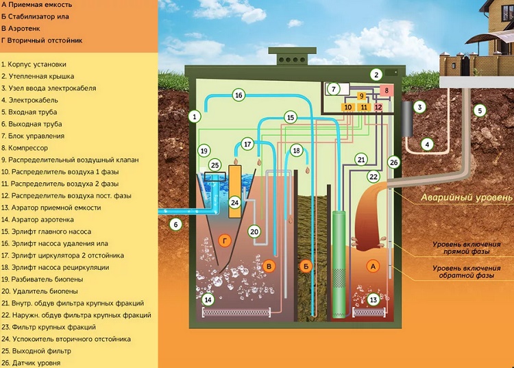 Para garantir um tratamento eficiente das águas residuais na instalação de esgoto, existem elevadores aéreos, compressor, bombas, aeradores, distribuidores de ar, filtros e bocais para entrada e saída de fluido.