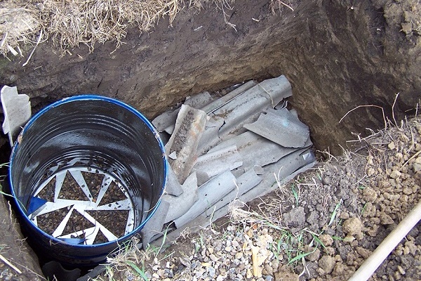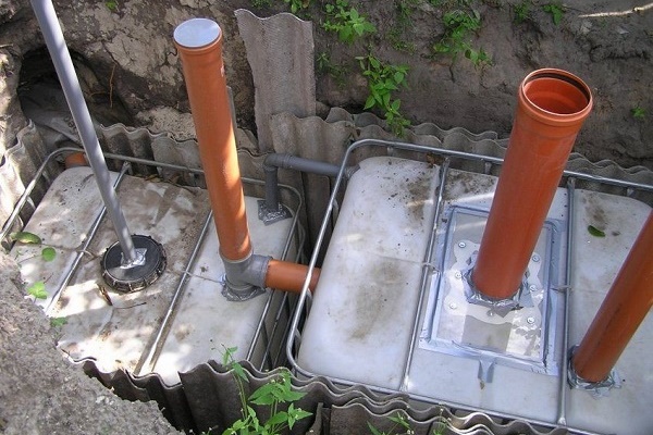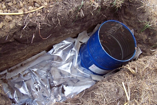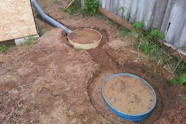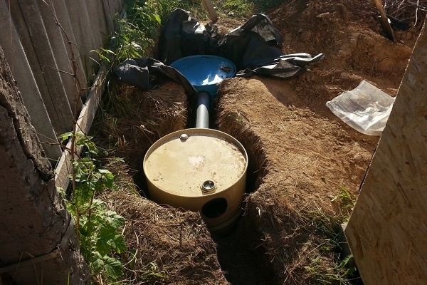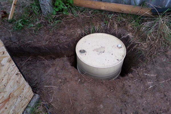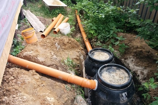 Existem várias opções para a construção de uma fossa a partir de contêineres (ou barris) usados. O mais simples é a instalação de um único tanque a uma distância de 5 a 7 m da casa (o mais próximo não é recomendado pelos padrões sanitários). Se houver vários barris, eles são conectados por um tubo de transbordamento e um poço oblongo é cavado.