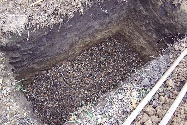 Camadas de cascalho ou pedra britada estão localizadas mais alto: primeiro uma fração fina, depois uma grande. Eles mantêm grandes impurezas e clarificam a água. Assim, é realizada uma purificação em várias etapas das águas residuais descartadas no solo, onde são processadas adicionalmente em condições naturais.