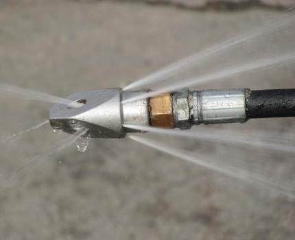 Essa é a maneira mais eficaz para casos "graves". É usado apenas por profissionais. Por exemplo, para trabalhar com bujões sólidos no meio de um tubo, para limpar esgotos em casas particulares ou esgotos principais. Um dispositivo profissional hidrodinâmico é usado para limpar tubos com um diâmetro de 5 a 150 mm.