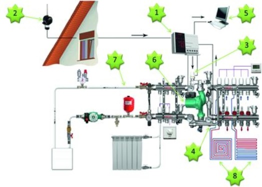 Em qualquer esquema, existe uma tubulação para fornecimento de refrigerante, válvulas de fechamento que permitem ajustar e configurar o sistema de aquecimento.