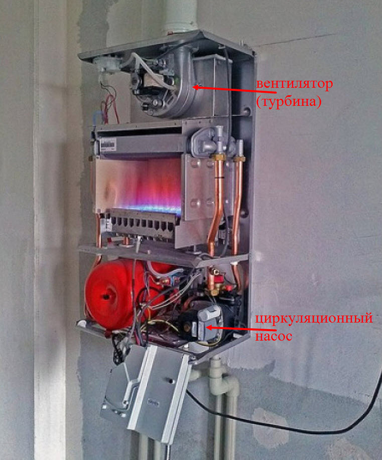 Um ventilador (turbina) em uma câmara de combustão fechada também consome eletricidade, mas menos que uma bomba circular. Os custos são justificados pela melhor remoção de fumaça. Caldeira com chaminé coaxial Não queima oxigênio na sala, não libera monóxido de carbono e produz menos ruído.