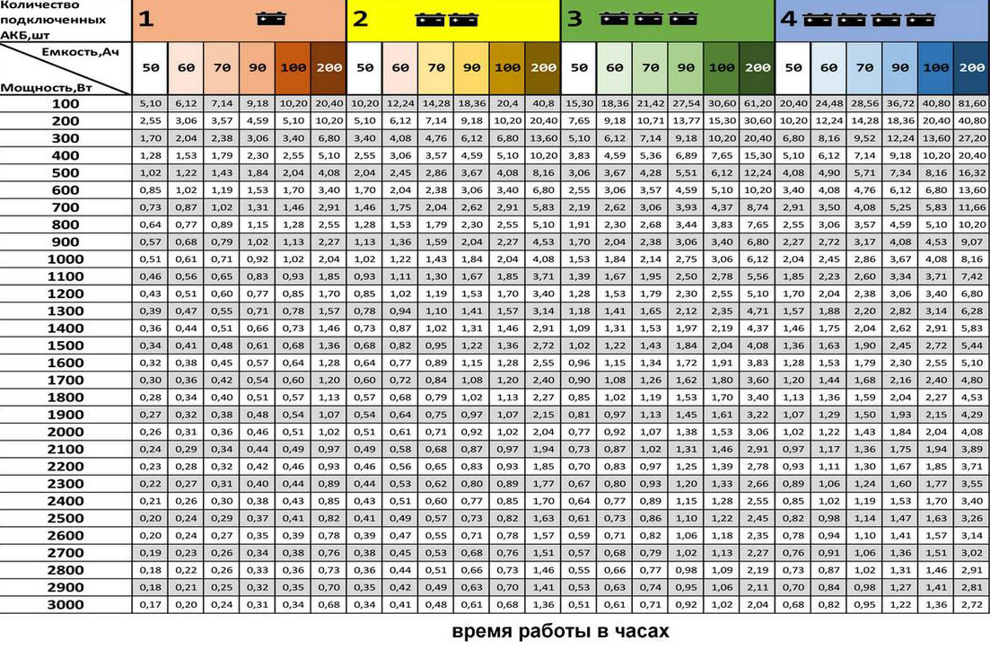 Quanto à capacidade da bateria, então, por exemplo, uma única bateria com capacidade de 50 Ah é suficiente para um consumo de energia de 100 W por 4-5 horas de operação. Para garantir 9 a 10 horas de operação, você precisa de duas baterias, etc.