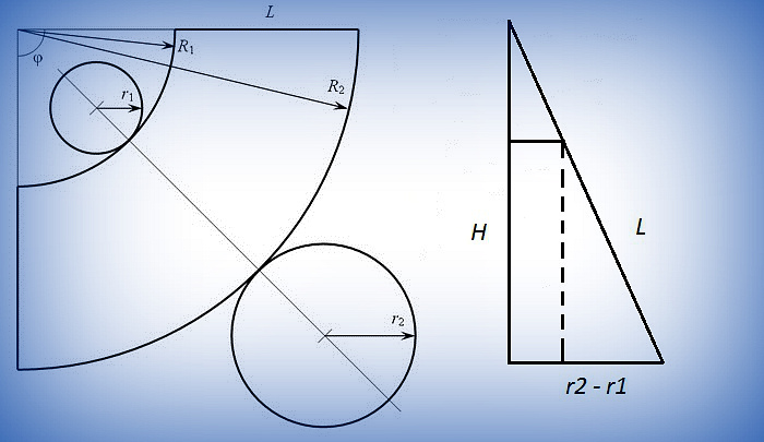 Portanto, se a altura do defletor for 168 mm e o diâmetro 280 mm, o raio da peça de trabalho será 219 mm e sua circunferência será Lm = 218,7 x 2 x 3,14 = 1373 mm. O cone desejado terá uma circunferência de 280 x 3,14 = 879 mm. Portanto, 879/1373 x 360⁰ = 230⁰. O setor de corte deve ter um ângulo de 360 - 230 = 130⁰.