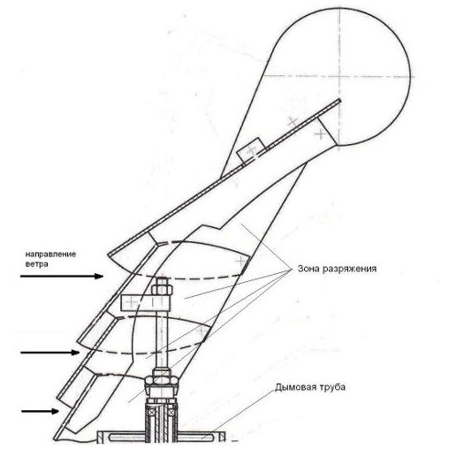O impulso é amplificado em qualquer direção do vento, exceto na horizontal. Neste último caso, vórtices de ar são formados dentro do dispositivo, cortando os caminhos de saída de fumaça. Essa desvantagem significativa é eliminada pela adição de um elemento adicional - o cone inverso.