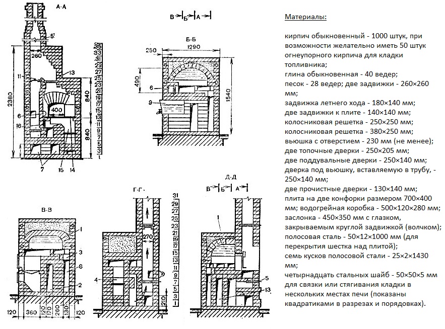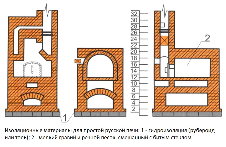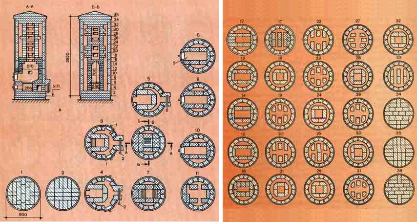 Não vamos nos concentrar na análise das regras, os esquemas mostram a alvenaria em detalhes. Observe que, na 21ª linha, o teto é coberto com areia e tijolos rachados para aumentar a transferência de calor da estrutura.